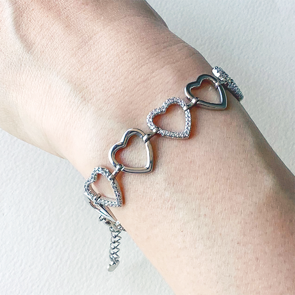 ハートモチーフをぐるっと一周連ねたチェーンブレスレット。キュービックジルコニアをセットしたモチーフと鏡面のモチーフを組合せたデザインです