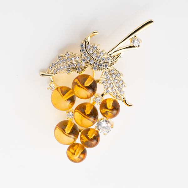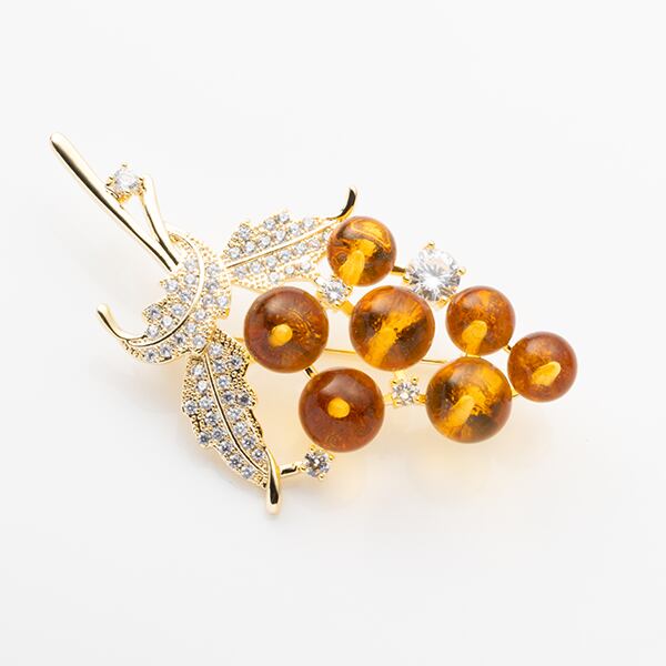 今にも芳醇な香りが薫ってきそうな熟した葡萄を、琥珀調のビジューで表現。添えるだけで装いが華やぐ、洗練された一品です