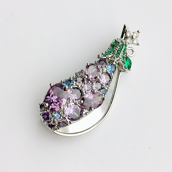 キュービックジルコニアを散りばめたブローチ。ぷっくりとかわいい小茄子をモチーフに、合計34石以上のキュービックジルコニアにシェルを組合せ、存在感たっぷりにデザインしました。縁起物としてシーズン問わずお使いいただきたいモチーフブローチです