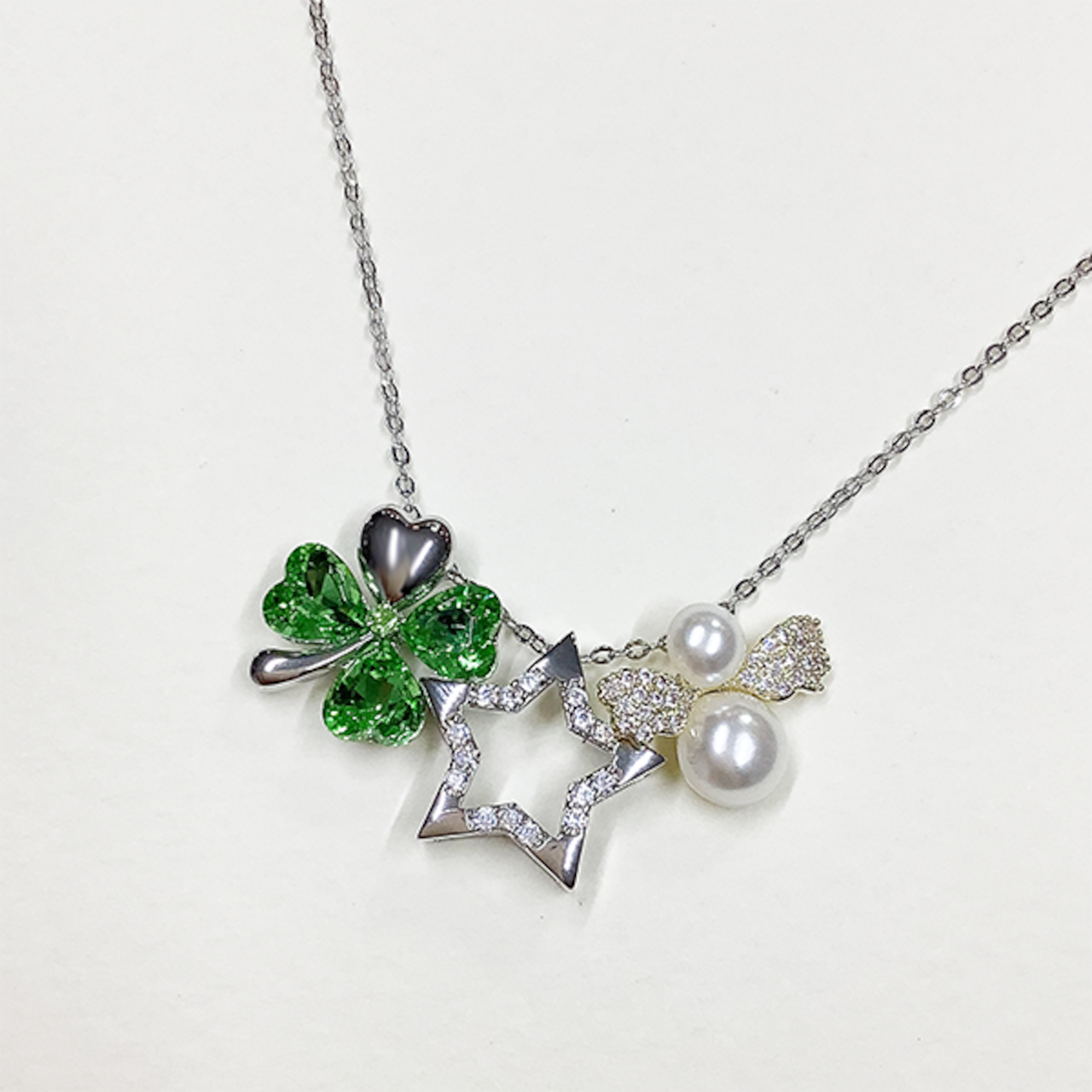 ペンダントのフェイス(枠一周)にあしらったクリスタルガラスの石数は合計で36石以上。クリスマスコフレのチャームの"スター"は希望、"クローバー"は幸せ、"エンジェル"は愛の象徴としてイメージしてデザインしています