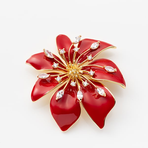 ポインセチアをモチーフにしたブローチ。大ぶりで色鮮やかなお花をエポキシ樹脂(花びら部分)とキュービックジルコニア(花芯部分)でゴージャスに表現しました