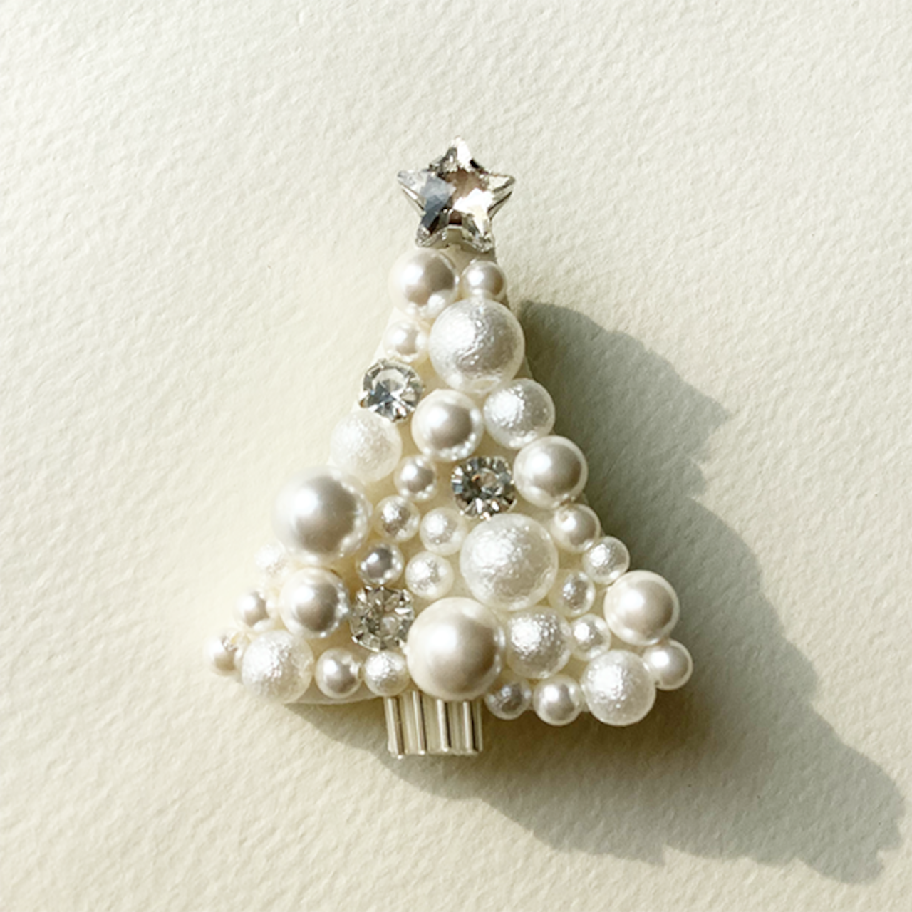 樹脂パール、ビジュー、ビーズを使用したクリスマスツリーのブローチ。合成繊維のベースにパーツを1つ1つ糸留めした手の込んだ作りです