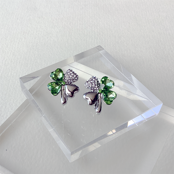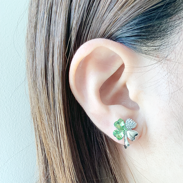 ハッピー・ラッキーのシンボルとして人気の四つ葉のクローバーをイヤリングまたはピアスに。シルバーカラーに透き通るようなグリーンが映える、爽やかなデザインです
