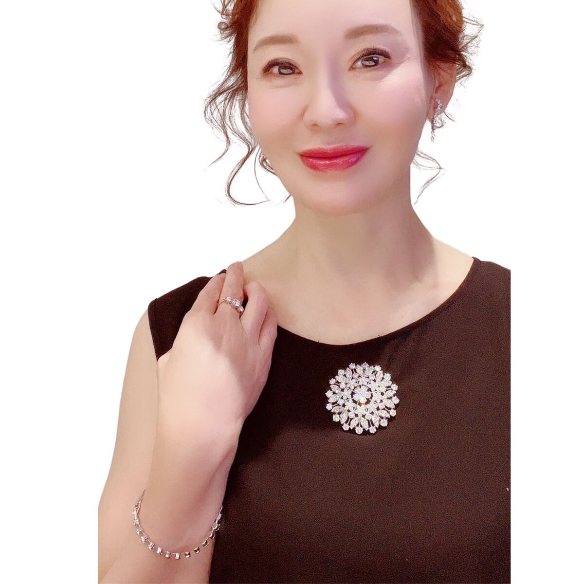合計110石以上のキュービックジルコニアを使用したラウンドブローチ。どんなファッションにもシーンにも合わせやすいオールマイティーなデザインです。季節によってフラワーに見えたり、雪の結晶に見えたり、時々の表情をお楽しみいただけます