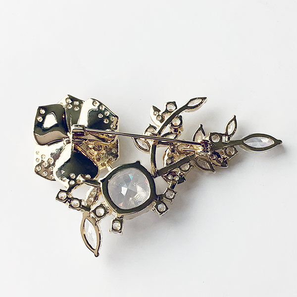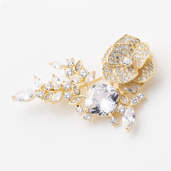 キュービックジルコニアをふんだんに使用した華やかなブローチ。繊細なつくりで気品あふれる薔薇を表現しました