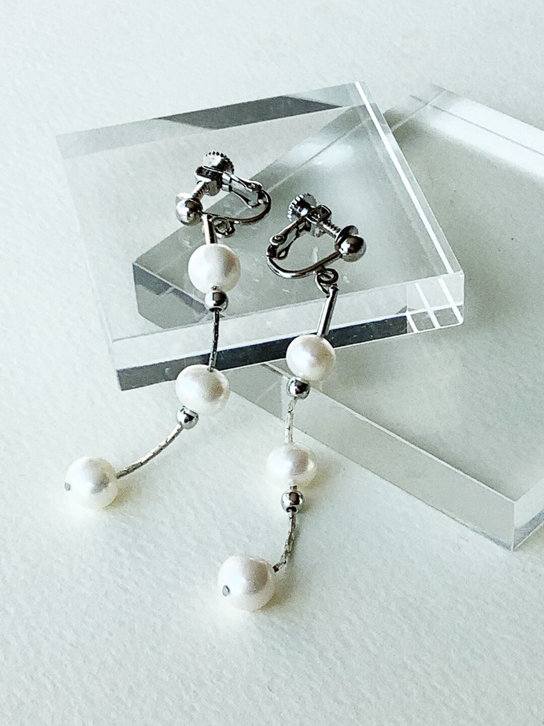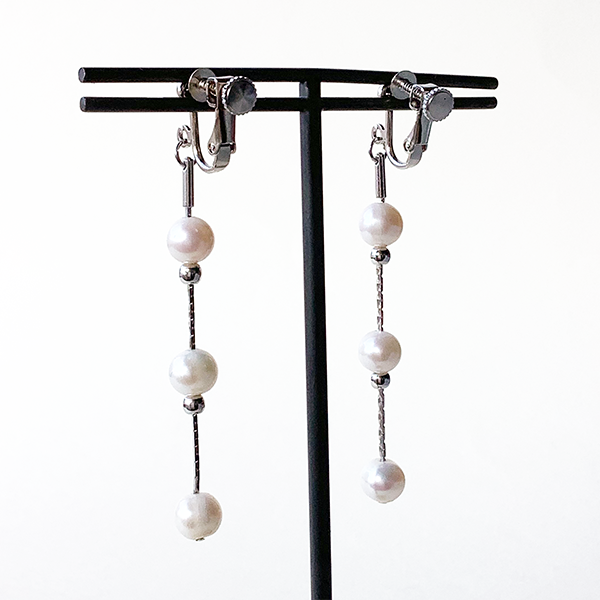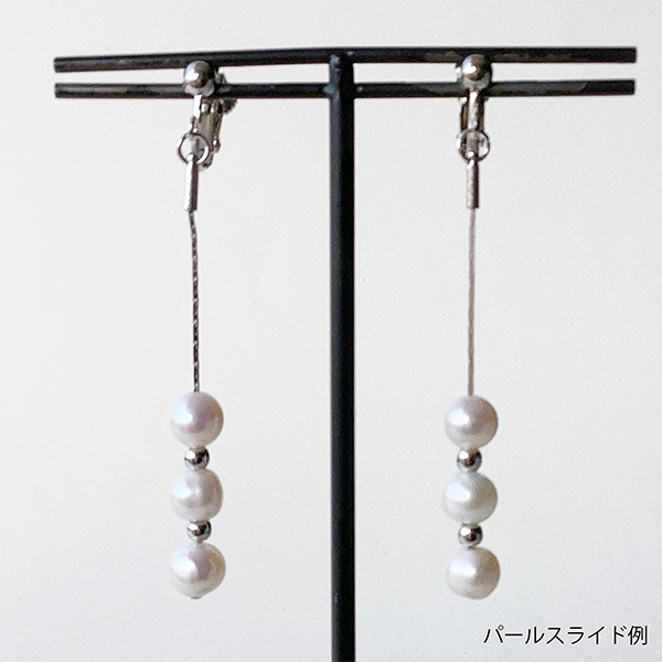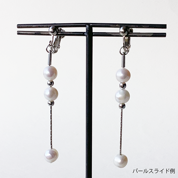 淡水パールをあしらったイヤリングまたはピアス。淡水パールをお好きな位置に移動させてアレンジできる、スライドタイプのデザインです