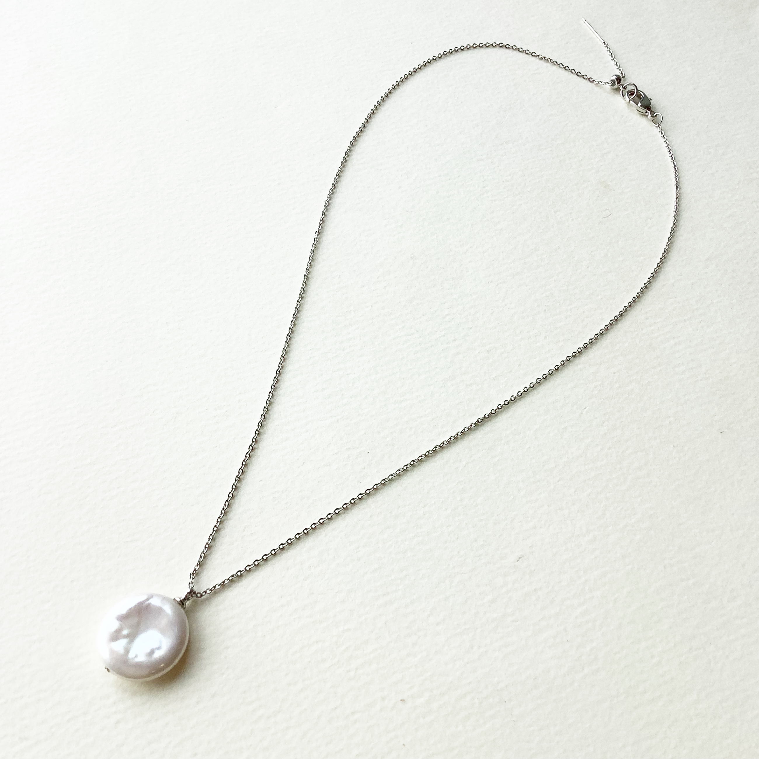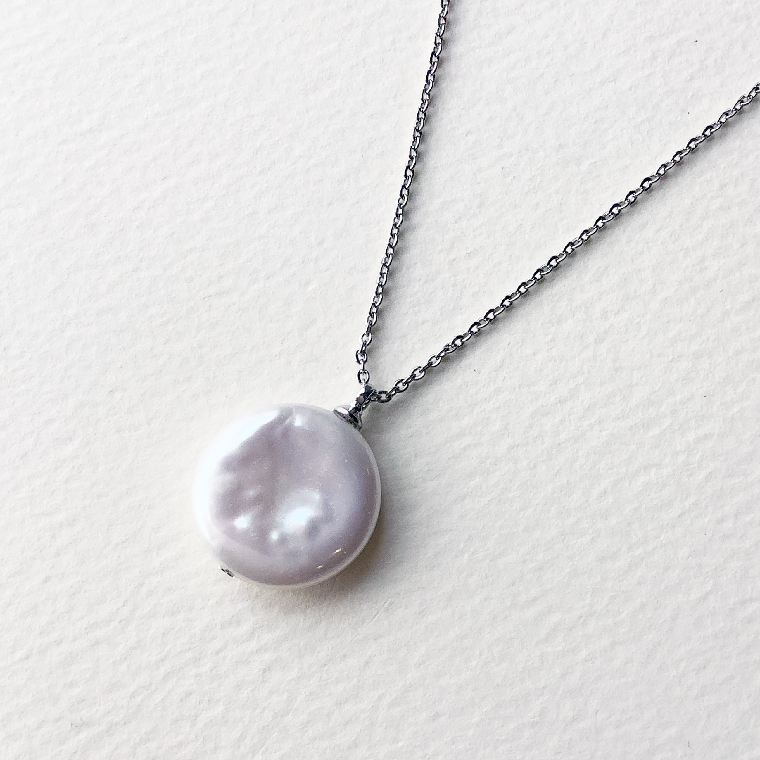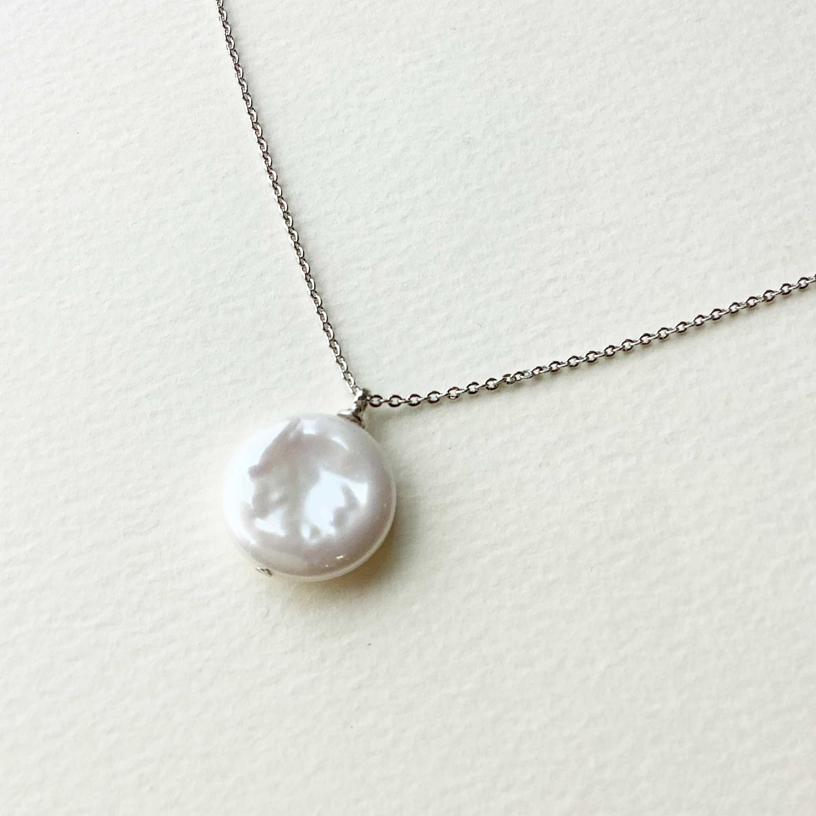 シンプルな淡水コインパールのペンダント。様々な装いにデイリーで合わせやすく、胸元をさりげなく上品に演出してくれます
